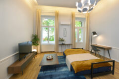 Perfectly located 1 Bedroom apartment located at the Liszt Ferenc Square in a very stylish classical and partially renovated building with elevator. The apartment is located on the 1st floor and has a classical Viennase design. The kitchen is very well equipped with all the necesarry utensils for cooking. The apartment has a full bedroom, and a huge living room. The apartment has bright spaces, the interior design is carefully picked up and equipped with the finest furniture . The furniture and the interior can be modify based on the requirements. Great place for living, shooting commercials, series.